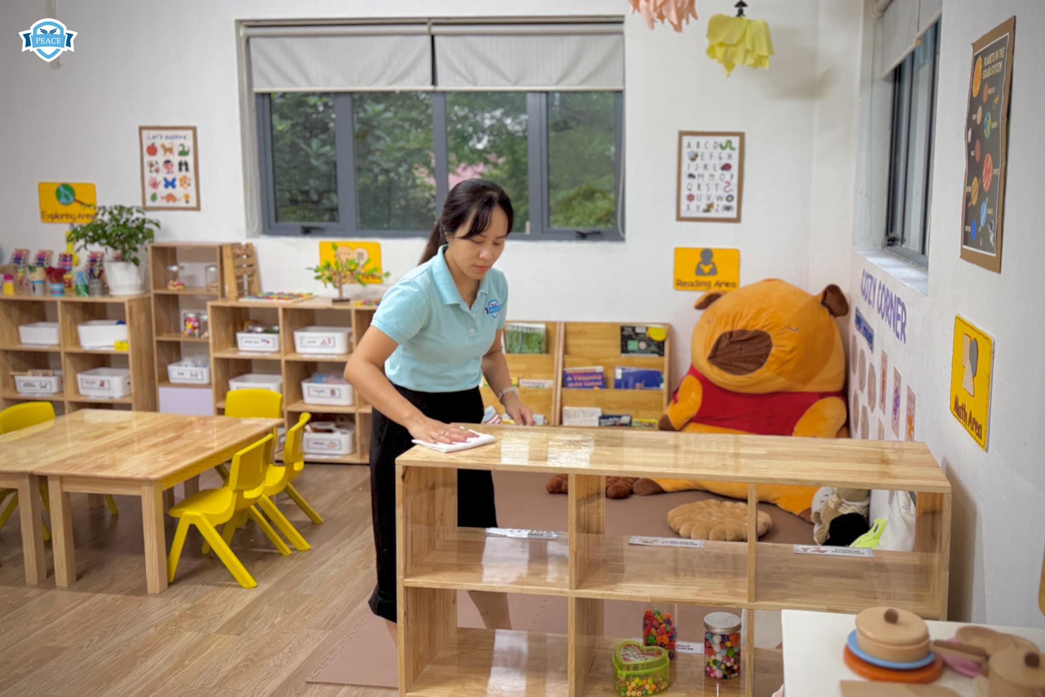 Việc vệ sinh, khử khuẩn trường lớp luôn được duy trì đều đặn hàng tuần và tăng cường ngay khi cần thiết. Các bề mặt tiếp xúc thường xuyên được lau dọn sạch sẽ, đồ dùng học tập và đồ chơi được làm khô và sắp xếp gọn gàng sau buổi học.